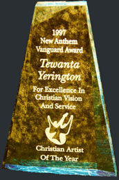 For directing and managing a music ministry with a level of impact to leave churches permanently changed through the experience of their worship and ministry; lives changed and people come to salvation as a result of meeting the Lord through their worship with her; maintaining the highest level of artistry and craftsmanship in dedicated Christian music; for keeping her vision of Christian service through adversity and personal trial, and not allowing persecution to stall out her ministry to others, we gratefully confer this recognition to our sister in Christ, Tewanta Yerington.